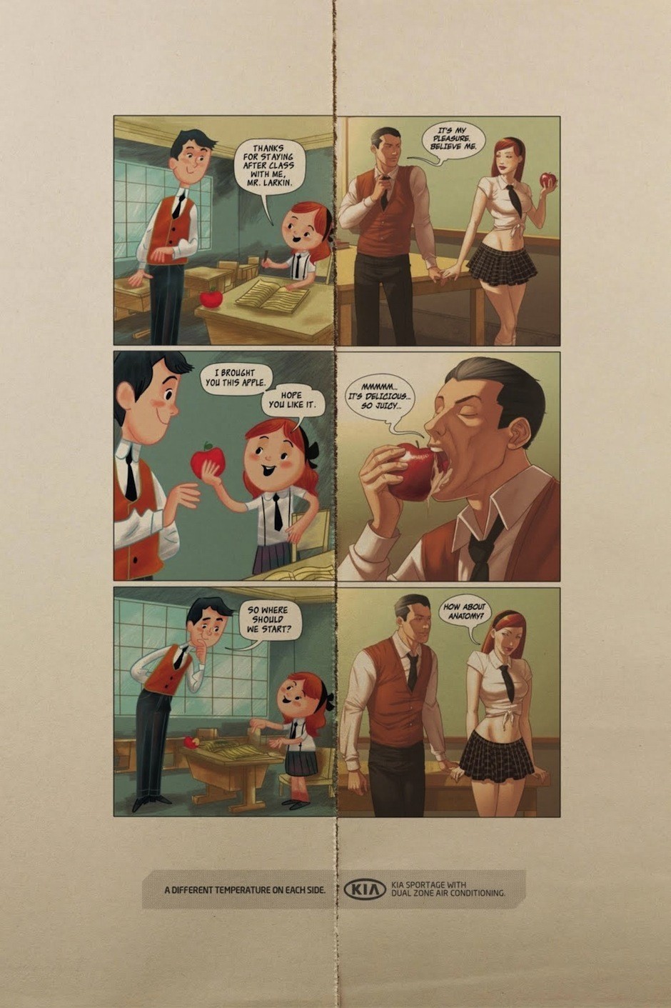 To the right, you are going to see an “Award Winning” Advertisement from KIA involving a teacher and a student. Be warned the Ad is considered disturbing by many observers. Please help us tell KIA and advertising firms around the world that this approach to marketing and selling is unacceptable! To promote pedophilia to sell or market a product is both sad and disgusting.